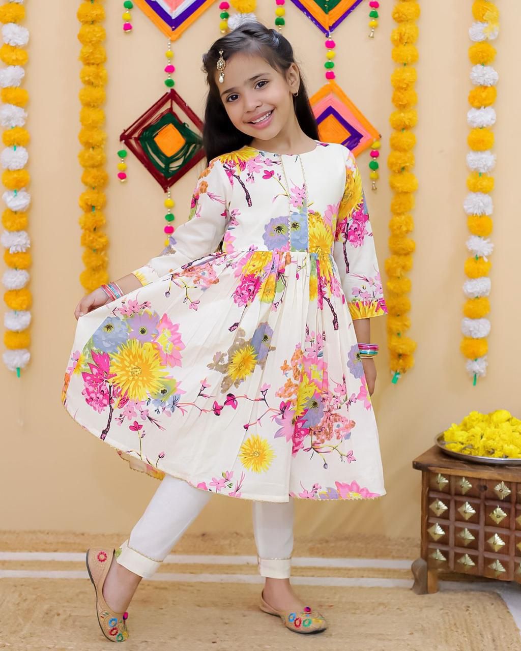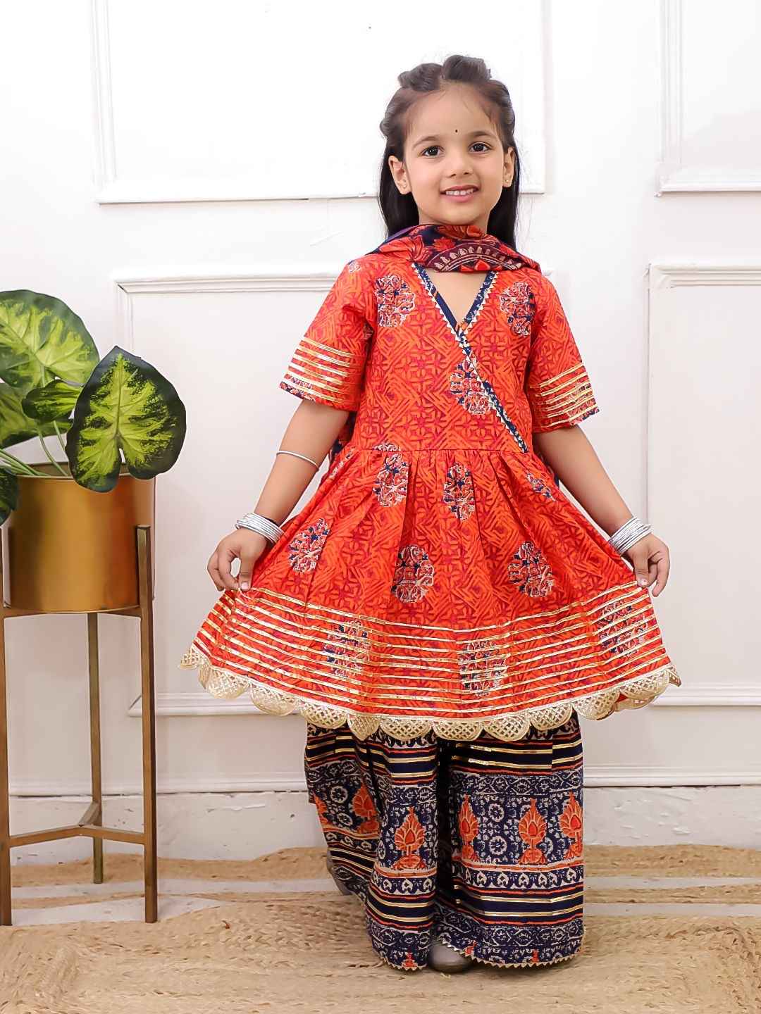 Beautiful Three-piece set for girls,perfect for festive and traditional occasions.The set includes a bright red printed Kurti with golden lace.It is paired with navy blue and red printed sharara pants