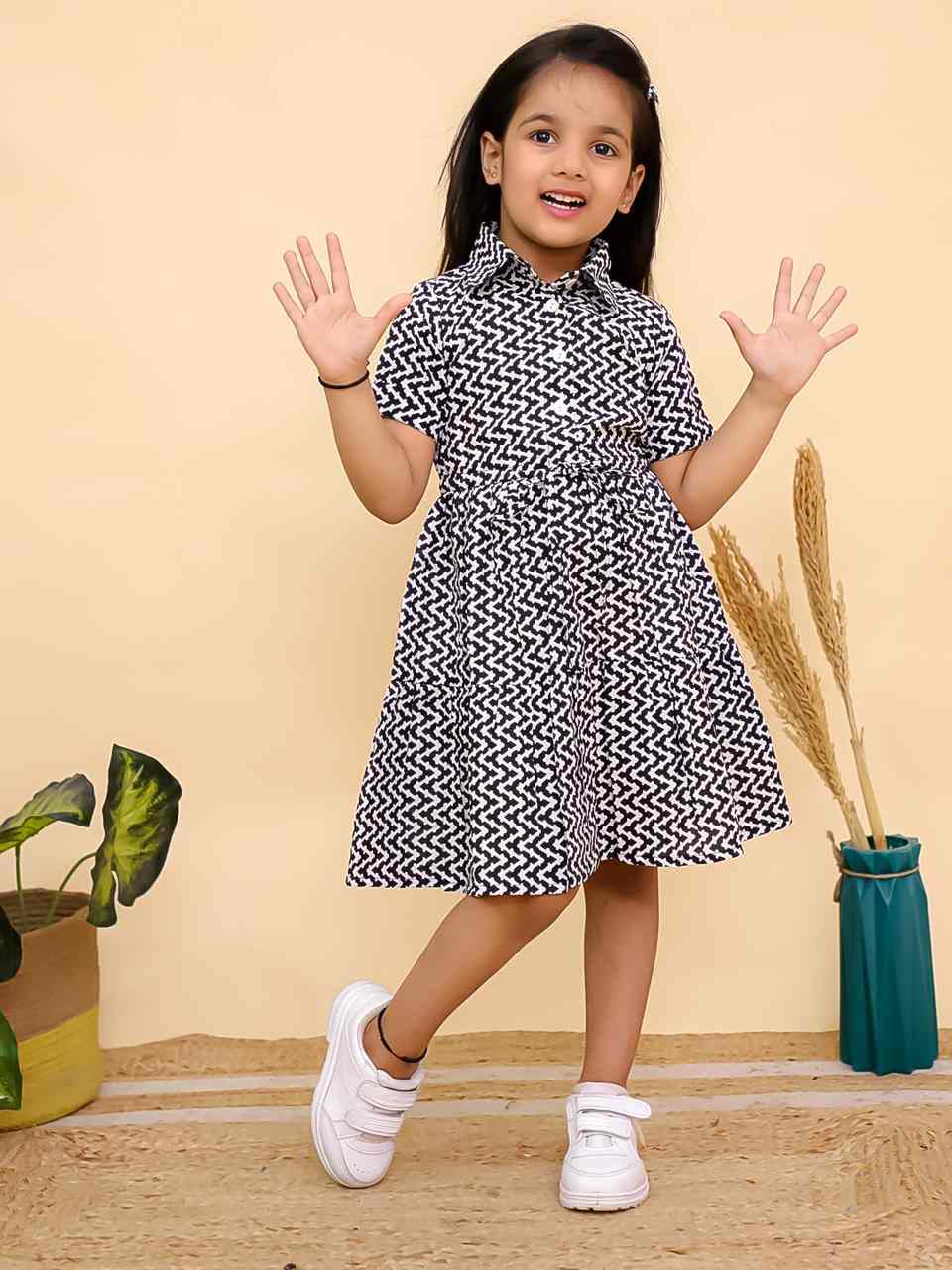 This dress has a button down front.It comes in a vibrant geomatic print and its fabric is cotton